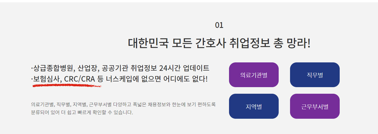 너스케입 커리어는 2001년부터 시작된 간호사 대표 커뮤니티인 만큼 순수 RN(Registered Nurse) 기반의 간호사 전문 취업 플랫폼입니다. 누적 공고 수가 많은 만큼 선택의 폭이 넓지요. 보험심사, CRC/CRA 등의 공고도 너스케입에 없으면 어디에도 없을 정도라고 자부하는 홈페이지네요.