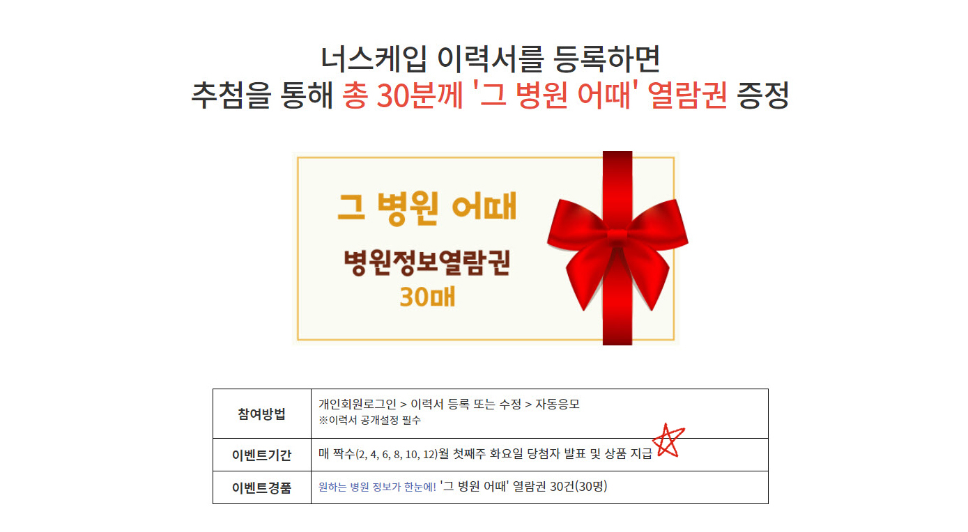 이력서를 등록하면 '그 병원 어때' 열람권 30건 당첨될 수 있어요. 병원뿐만 아니라 어떤 회사든 어떤 곳인지 솔직 후기를 읽어보면 취직이나 이직에 큰 도움을 받을 수 있습니다. 무턱대고 들어갔다가 성격상 쉽게 나오지 못하여 끙끙 앓는 분들도 많습니다.