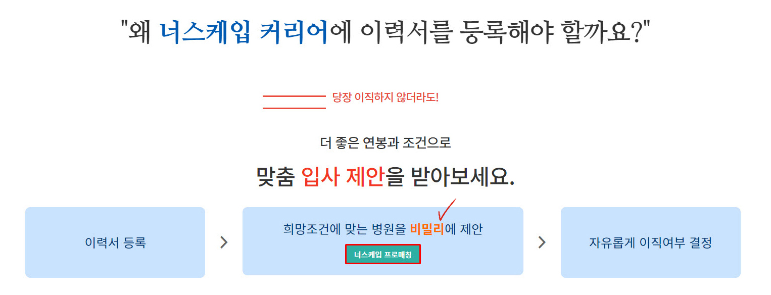 당장 이직하지 않더라도 이력서 작성을 잘해서 등록하면 희망 조건에 맞는 병원이 제안을 할지도 모릅니다. 어쩔 수 없이 버티고 있을 때 제안을 받게 된다면 정말 기쁠 것 같아요. 희생과 봉사정신의 직업이지만 그만큼 자신의 권리나 좋은 연봉도 함께 했으면 좋겠습니다.