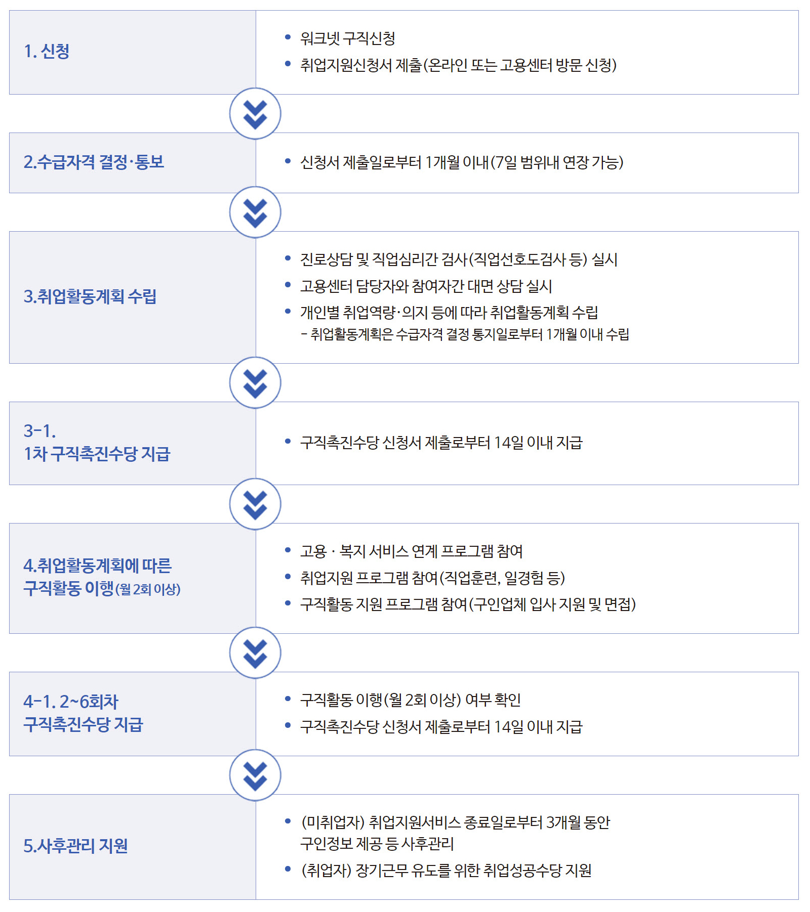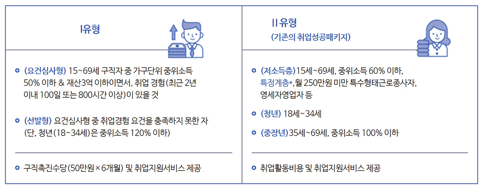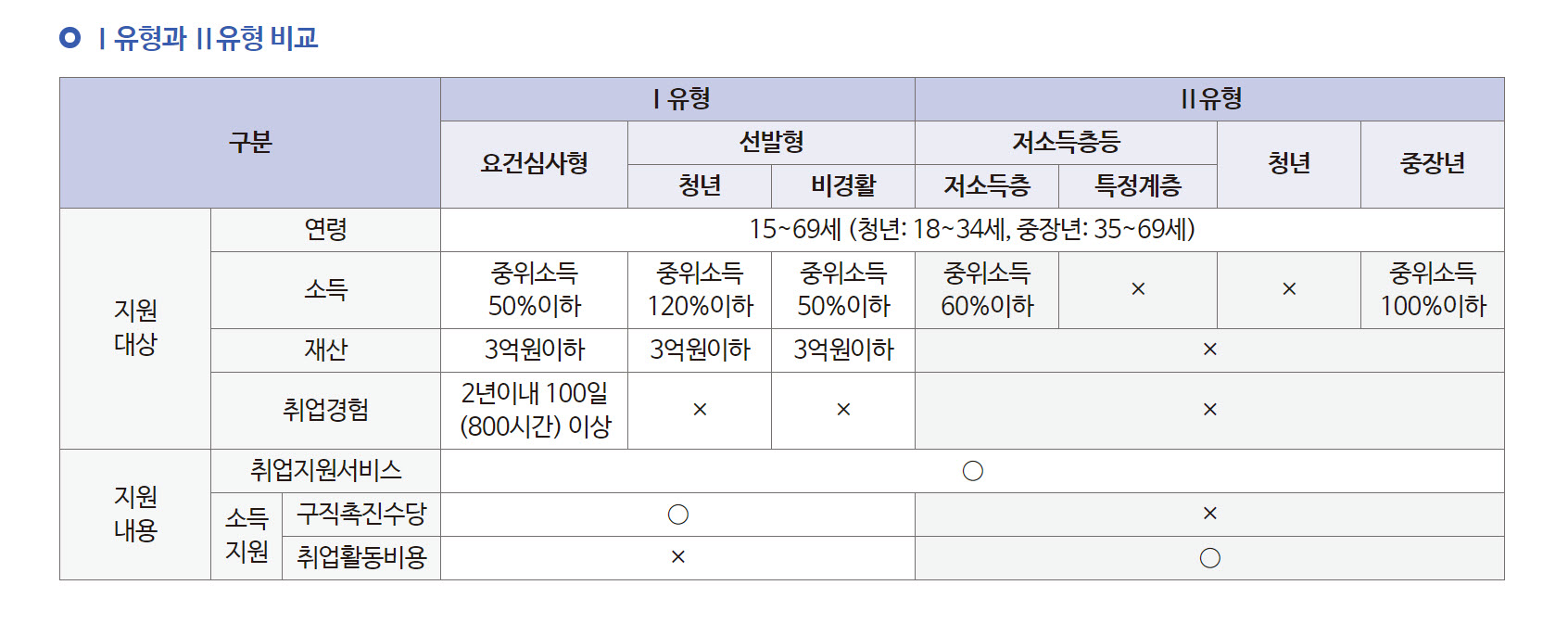 두 가지 유형 참여자 모두에게 취업지원 서비스를 제공합니다. 고용센터 담당자가 상담을 해주고, 개인별 취업의 어려움과 취업 능력에 따라 취업활동을 계획해줍니다. 직업훈련, 일 경험, 복지서비스 연계, 취업알선 등 각종 취업지원 및 구직활동을 지원합니다. 물론 1 유형에 속하면 더 큰 혜택을 받을 수 있으니 더 꼼꼼하게 자신의 유형을 체크해 보세요.